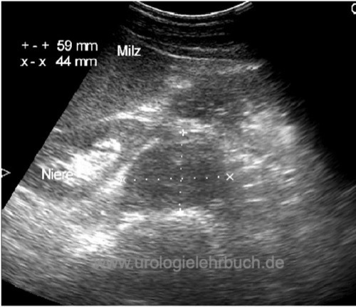Die Sonographie des Abdomens ist geeignet für eine schnelle Diagnose einer fortgeschrittenen Erkrankung [Abb. Retroperitoneale Metastase im US Abdomen]. Das CT-Abdomen ist sensitiver und kann durch die Sonographie nicht ersetzt werden.