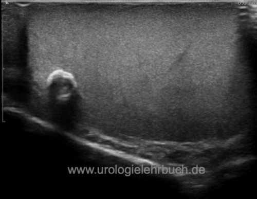 In der Sonographie der Hoden manifestiert sich ein Hodentumor typischerweise als echoarme bis echogemischte Läsion im Hodenparenchym mit verstärkter Durchblutung [Abb. Seminom im Ultraschall], [Abb. Teratom im Ultraschall] und [Abb. Embryonales Karzinom im Ultraschall].
